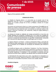 De acuerdo con el comunicado, las labores de rescate se llevan a cabo en tres turnos y en ellas participan personal de la empresa propietaria de la mina y funcionarios de la Agencia Nacional de Minería y de la propia Alcaldía.