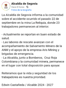 «Esta emergencia minera, causada por una falla geomecánica, está siendo atendida por brigadistas de la empresa Aris Mining y por el equipo de Seguridad y Salvamento Minero de la ANM desde el momento en que se reportó», añadió la autoridad minera.