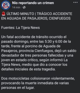 Un lamentable accidente de tránsito ocurrido el pasado domingo, entre las 5:30 y 6:00 de la tarde, ha conmocionado a la población de Aguada de Pasajeros, en la provincia de Cienfuegos. El hecho tuvo lugar frente al porcino de la localidad y dejó un saldo de tres personas fallecidas y una joven en estado crítico, según reportaron La Tijera News y Nio Reportando Un Crimen.