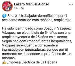 El incidente ocurrió durante labores de mantenimiento en una subestación ubicada en La Habana un componente clave del sistema electroenergético que alimenta diversos territorios de la ciudad cuando, por causas que aún están siendo investigadas, se produjo una explosión seguida de un arco eléctrico, que impactó directamente a uno de los técnicos presentes en el lugar.
