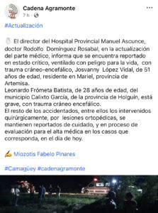 Por su parte, Leonardo Frómeta Batista, de 28 años, natural del municipio Calixto García en Holguín, está reportado grave tras sufrir un trauma craneoencefálico moderado.