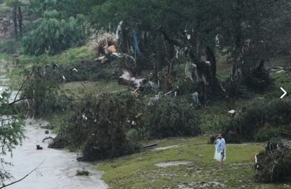 Las lluvias comenzaron durante la madrugada y, en menos de dos horas, el nivel del río Guadalupe subió más de seis metros, arrasando viviendas y campamentos. Erin Burgess, residente de la zona, relató el momento de terror que vivió con su familia: “Mi hijo y yo flotamos hasta un árbol donde nos agarramos, y mi novio y mi perro se alejaron flotando. Estuvo perdido un rato, pero los encontramos”, contó emocionada.