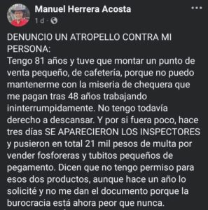 Un ciudadano de 81 años ha denunciado públicamente lo que califica como un abuso por parte de inspectores estatales contra su pequeño negocio de cafetería en el municipio de Mayarí. El adulto mayor, cuyo nombre es Manuel Herrera Acosta, asegura que, tras más de 48 años de trabajo ininterrumpido, se vio obligado a emprender para poder subsistir ante lo que describe como una pensión insuficiente.