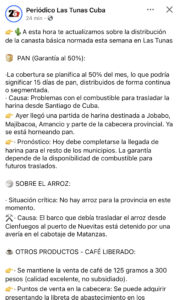 De acuerdo a una publicación en la página de facebook “Periódico Las Tunas Cuba”,ayer arribó una partida destinada a municipios como Jobabo, Majibacoa, Amancio y parte de la cabecera provincial, entregando pan en esas localidades , mientras que el resto de los territorios aún espera completar el suministro, siempre condicionado a que exista combustible suficiente para futuros traslados, lo cual convierte algo tan básico como el pan en un producto incierto para la mayoría de la población.