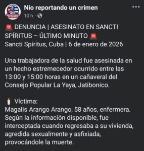 Un estremecedor hecho de violencia ha conmocionado a la provincia de Sancti Spíritus. Una trabajadora del sector de la salud fue víctima de un brutal asesinato ocurrido en la localidad de La Yaya, municipio Jatibonico, entre la 1:00 y las 3:00 de la tarde en un cañaveral cercano a un campamento agrícola.