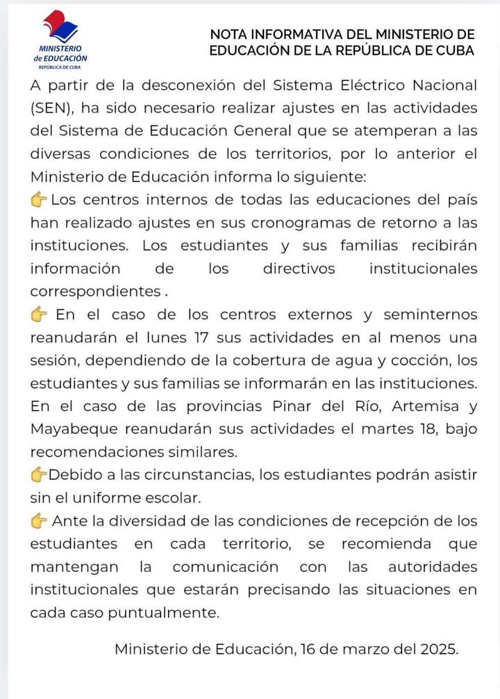 El Ministerio de Educación de Cuba ha emitido una nota informativa en la que anuncia ajustes en las actividades del Sistema de Educación General tras la reciente desconexión del Sistema Eléctrico Nacional (SEN). La situación energética ha generado la necesidad de modificar el retorno a clases en centros educativos de todo el país, adaptándose a las condiciones específicas de cada territorio.