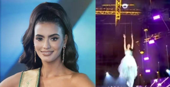 Durante el segmento “Alcanza la corona”, uno de los desafíos de mayor tensión del concurso, las participantes debían lanzarse desde una plataforma sujetadas por un arnés con el objetivo de alcanzar una corona suspendida en el aire. Al llegar el turno de la cubana, todo parecía transcurrir con normalidad hasta que, en plena ejecución, una falla técnica en el equipo de sujeción provocó una aparatosa caída.