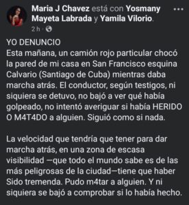 La usuaria María J. Chávez publicó en su cuenta de Facebook una denuncia que ha generado numerosas reacciones entre los residentes de Santiago de Cuba. Según su relato, un camión rojo particular impactó contra la pared de su vivienda ubicada en la esquina de San Francisco y Calvario, y el conductor se dio a la fuga sin detenerse a verificar los daños ni comprobar si había heridos.