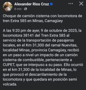 A las 9:20 pm del 9 de octubre de 2025, la locomotora 38141 del Tren Extra 585, que cubría la ruta Camagüey-Nuevitas, recibió un impacto en un paso a nivel a la altura del km 31,300 en Minas. Un camión cisterna de combustible, propiedad de CUPET, se interpuso en su paso. Como resultado, la locomotora descarriló y quedó en posición semi volcada. El tren partió a las 5:40 pm desde la estación Camagüey con cinco coches y debía llegar a Nuevitas a las 8:40 pm del mismo día.