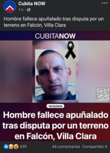La tranquilidad del poblado de Falcón, en Villa Clara, fue abruptamente interrumpida por un hecho que ha generado consternación. De acuerdo al sitio de noticias CubitaNOW, el ciudadano Didier Valdivia perdió la vida tras un violento enfrentamiento con Greidy Faunde, con quien mantenía diferencias por la posesión de un terreno.