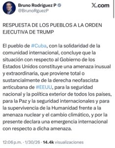 En un mensaje publicado en la red social X y reproducido por el Ministerio de Relaciones Exteriores (MINREX), Rodríguez calificó al gobierno de Trump como una “amenaza inusual y extraordinaria”, acusándolo de estar impulsado por “una derecha neofascista anticubana”. Según el canciller, la medida estadounidense no solo representa una escalada contra Cuba, sino también un riesgo para la paz mundial y la estabilidad internacional.