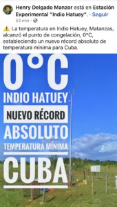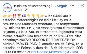 A las 04:00 am la estación meteorológica de Indio Hatuey en la provincia de Matanzas reportaba una temperatura mínima de 0.1°C, sin embargo esta cifra continuó bajando y a las 07:00 el termómetro registraba en la misma estación una temperatura de 0°C…Esta cifra constituye NUEVO RECORD DE TEMPERATURA MINIMA PARA EL PAIS