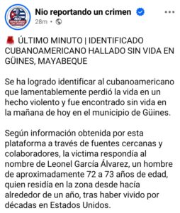 La identidad del hombre hallado sin vida en la mañana de este lunes en el municipio de Güines, provincia Mayabeque, ha sido confirmada como Leonel García Álvarez, un cubanoamericano de aproximadamente 72 a 73 años de edad, según información difundida a través de la plataforma Nio Reportando Un Crimen en Facebook.