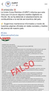 La Unión Cuba-Petróleo (CUPET) desmintió este viernes la información que circula en algunos medios digitales sobre una supuesta paralización del abastecimiento de combustibles a la red de servicentros del país. La empresa estatal calificó el texto, atribuido a un comunicado conjunto con el Ministerio de Turismo (MINTUR), como falso y exhortó a la población a seguir solo las fuentes oficiales para mantenerse correctamente informada.