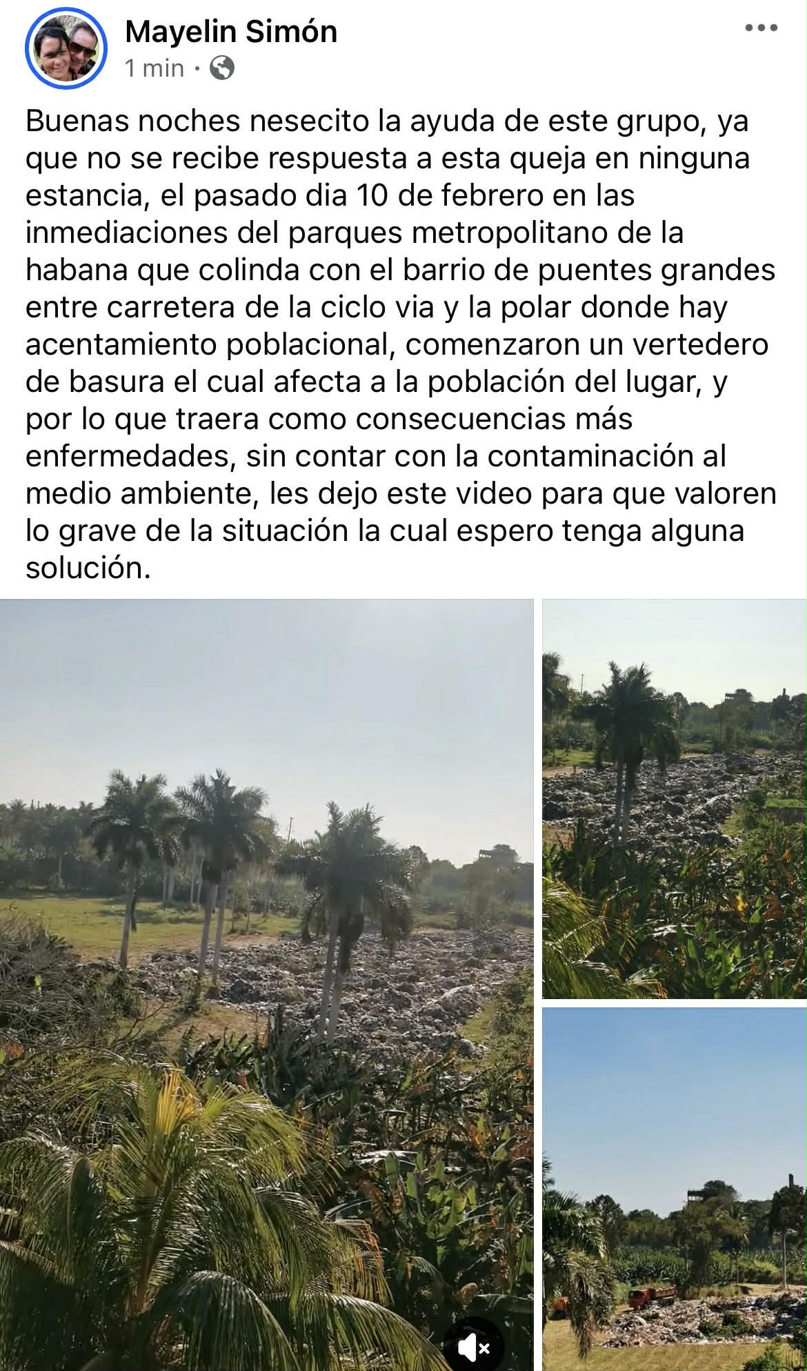​Buenas noches necesito la ayuda de este grupo, ya que no se recibe respuesta a esta queja en ninguna estancia, el pasado día 10 de febrero en las inmediaciones del parques metropolitano de la habana que colinda con el barrio de puentes grandes entre carretera de la ciclo via y la polar donde hay asentamiento poblacional, comenzaron un vertedero de basura el cual afecta a la población del lugar, y por lo que traerá como consecuencias más enfermedades, sin contar con la contaminación al medio ambiente, les dejo este video para que valoren lo grave de la situación la cual espero tenga alguna solución.