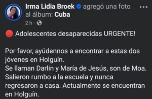 La desaparición de 2 adolescentes en la provincia de Holguín ha generado gran preocupación entre familiares y vecinos del municipio Moa. Las jóvenes, identificadas como Darlin y María de Jesús, salieron rumbo a la escuela y no regresaron a sus hogares, lo que encendió las alarmas en la comunidad.