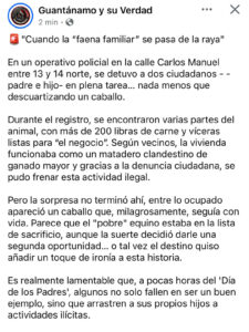 En un operativo policial realizado en la calle Carlos Manuel, entre 13 y 14 norte, fueron detenidos un padre y su hijo mientras realizaban una actividad ilegal que no solo pone en riesgo la salud pública, sino que también refleja una preocupante falta de ética y responsabilidad familiar: estaban descuartizando un caballo dentro de su vivienda, según información publicada en la página de Facebook Guantánamo y su Verdad
