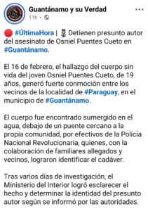 El Ministerio del Interior (MININT) informó sobre la detención del presunto responsable del asesinato del joven Osniel Puentes Cueto, de 19 años, un hecho que conmocionó a la localidad de Paraguay, en el municipio de Guantánamo, el pasado 16 de febrero.