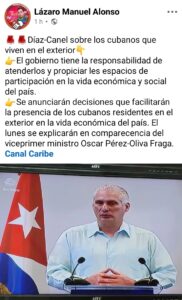 Durante la comparecencia, Díaz-Canel también se refirió a los cubanos que residen en el exterior, señalando que el gobierno tiene la responsabilidad de atenderlos y facilitar su participación en la vida económica y social del país.