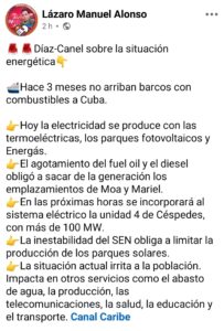 Díaz-Canel explicó que desde hace tres meses no arriban barcos con combustible a Cuba, lo que ha generado serias dificultades para sostener la generación eléctrica.