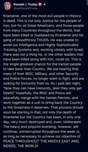 Trump indicó que su gobierno y aliados consideran que el ayaatolá Jamenei quien lideró Irán desde 1989 y se convirtió en uno de los personajes más poderosos del país habría sido eliminado durante ataques aéreos coordinados con Israel. El presidente estadounidense describió la operación como un golpe significativo a las estructuras de poder iraníes y dijo que muchos de los tomadores de decisiones dentro del régimen habrían sido abatidos.