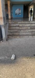 Degradación y abandono: placa dañada, escaleras rotas y oscuridad constante