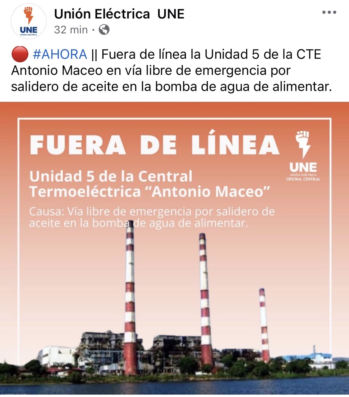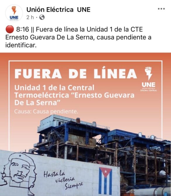 A esta avería se suma una nueva salida en el occidente del país: la Unidad 1 de la CTE Ernesto Guevara de la Serna, en Santa Clara, quedó fuera de línea por causas aún no identificadas. Esta falla ocurre apenas un día después de que la Unidad 2 de esa misma planta también saliera de servicio, agravando el panorama eléctrico nacional.