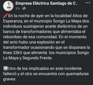 La Empresa Eléctrica de Santiago de Cuba informó este viernes sobre un trágico hecho ocurrido en la noche del jueves en la localidad de Altos de Esperanza, perteneciente al municipio Songo La Maya. Según el reporte oficial, dos individuos intentaron sustraer aceite dieléctrico de un banco de transformadores, acción que culminó con una violenta explosión y graves consecuencias humanas y materiales.