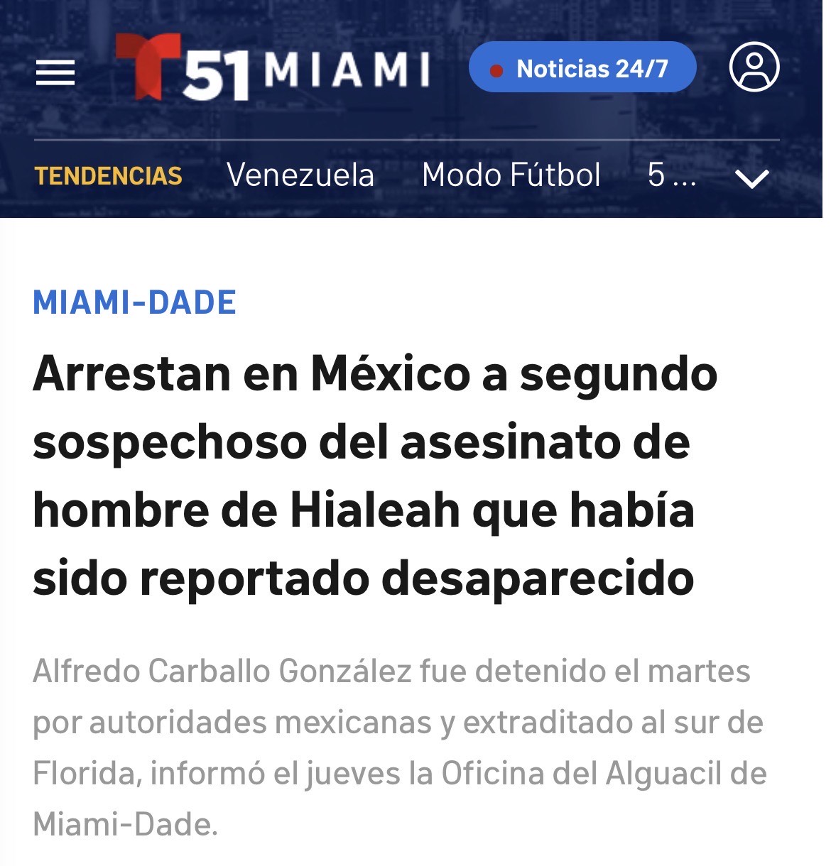 Carballo González, acusado formalmente de homicidio en segundo grado y manipulación de evidencia, fue arrestado el martes pasado en México. La MDSO confirmó su extradición inmediata a Miami-Dade este jueves, cerrando así la búsqueda de meses por este caso que generó alarma en la comunidad cubanoamericana de Hialeah.
