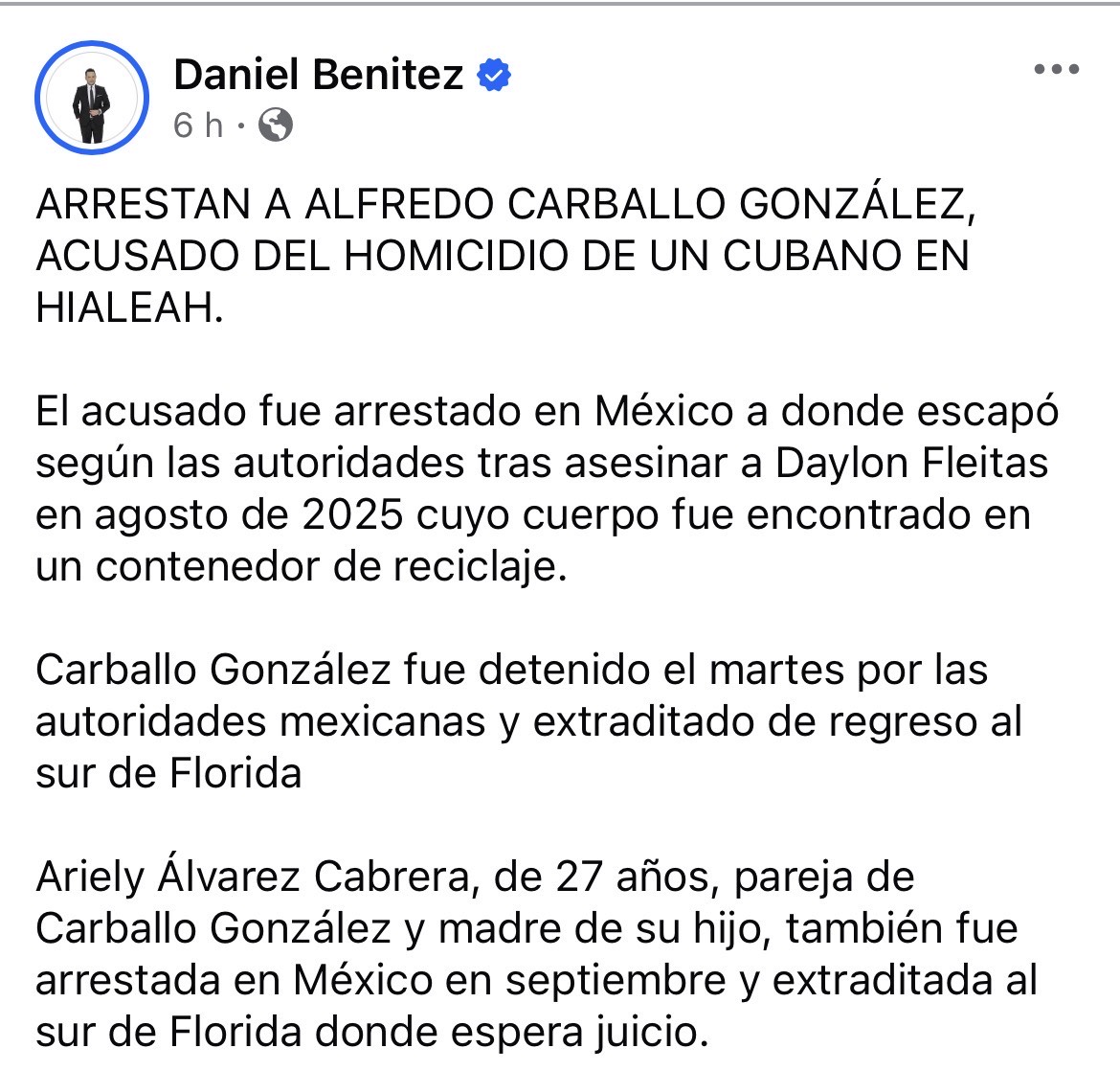 Autoridades mexicanas arrestaron el martes a Alfredo Carballo González, principal sospechoso del asesinato de Daylon Fleitas González, un cubano de 37 años reportado como desaparecido en Hialeah en agosto de 2025. Según información ofrecida por el periodista Daniel Benitez desde su perfil de Facebook, la Oficina del Alguacil de Miami-Dade confirmó este jueves la extradición del sospechoso al sur de Florida.