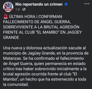 El municipio de Jagüey Grande, en la provincia de Matanzas, vuelve a estar de luto tras confirmarse el fallecimiento de Ángel Guerra, quien permanecía en estado crítico luego de sobrevivir inicialmente a la brutal agresión ocurrida frente al club “El Mambo”. Esta trágica noticia ha conmovido profundamente a la comunidad local, que ya había quedado impactada por el primer hecho violento ocurrido durante el pasado fin de semana.