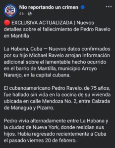 De acuerdo a la plataforma Nio Reportando Un Crimen, Pedro Ravelo, de 75 años, fue encontrado sin vida en la cocina de su vivienda ubicada en calle Mendoza No. 2, entre Calzada de Managua y Pizarro. Había regresado a Cuba el pasado viernes 20 de febrero tras residir por temporadas en Nueva York, donde viven sus hijos.