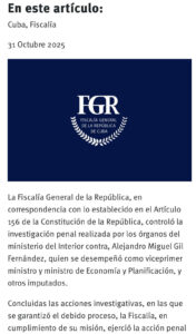 La Fiscalía General de la República de Cuba emitió este viernes 31 de octubre de 2025 una declaración oficial sobre el proceso penal seguido contra el exministro de Economía y Planificación, Alejandro Miguel Gil Fernández, quien también ejerció como viceprimer ministro del país.