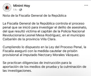La Fiscalía General de la República de Cuba emitió hoy una nota oficial relacionada con el asesinato del capitán de la Policía Nacional Revolucionaria (PNR) Leonel Mesa Rodríguez, ocurrido en el municipio de Caibarién, provincia de Villa Clara.