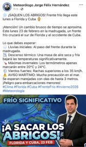 Un nuevo frente frío afectará el sur de la Florida y el occidente de Cuba desde la madrugada del lunes 23 de febrero, trayendo un notable cambio de tiempo tras varios días de calor inusual en la región, según informó el meteorólogo Jorge Félix Hernández.