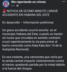 Un grave accidente de tránsito ocurrió anoche en el municipio capitalino de Habana del Este, cuando un tractor sin luces, que se encontraba circulando en sentido contrario, cruzó de manera repentina la Autopista Nacional para incorporarse al barrio conocido como Kala Kala, a la altura del kilómetro 14.