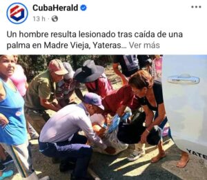 Un hombre sufrió lesiones este viernes en la localidad de Madre Vieja, municipio de Yateras, tras caer desde una palma mientras realizaba labores de poda. De acuerdo al medio CubaHerald, el incidente provocó una rápida movilización de los vecinos, quienes junto a voluntarios de la Cruz Roja brindaron los primeros auxilios antes de la llegada del personal médico de emergencia.