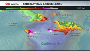 En el este de Cuba se prevén 10 a 20 pulgadas (250 a 500 mm), con picos de 25 pulgadas (630 mm) entre lunes y miércoles, mientras que en el sur de La Española las lluvias podrían alcanzar entre 6 y 12 pulgadas.
