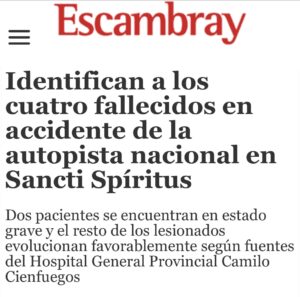 Las autoridades sanitarias de Sancti Spíritus confirmaron la identidad de las cuatro personas fallecidas en el trágico accidente ocurrido cerca del kilómetro 336 de la Autopista Nacional, alrededor de las 11 de la noche de este jueves. El siniestro dejó además 16 lesionados, dos de ellos en estado grave.