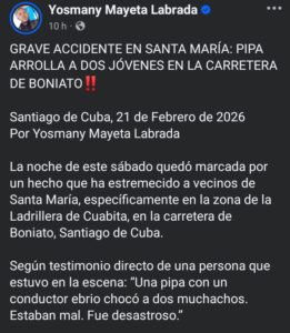 El reconocido comunicador independiente Yosmany Mayeta informó sobre el suceso a través de su perfil en Facebook, expresando sus condolencias hacia los familiares y narrando los primeros detalles del incidente.