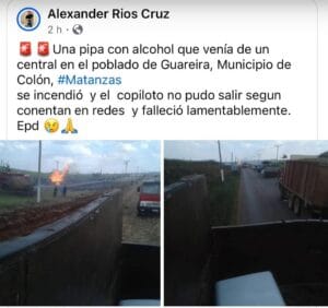 En el municipio de Colón, provincia de Matanzas, Cuba, un trágico accidente ocurrió este lunes 3 de marzo de 2025 cuando una pipa cargada de alcohol se incendió mientras transitaba desde el Central Azucarero del poblado de Guareira. El lamentable incidente dejó como saldo la muerte del acompañante del conductor, quien no pudo escapar del vehículo en llamas informa Alexander Rios Cruz en su perfil de Facebook.