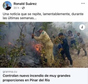 Un gran incendio forestal arrasó recientemente más de 2,500 hectáreas de bosque en Pinar del Río, afectando los municipios de San Juan y Martínez, Minas de Matahambre y Guane. El fuego, que se propagó rápidamente debido a la sequía, las altas temperaturas y la acumulación de material combustible, fue finalmente controlado tras varios días de intensos esfuerzos por parte de guardabosques y trabajadores forestales reportó en su cuenta de Facebook el periodista Ronald Suárez