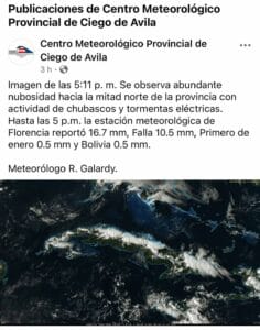 En la tarde de este domingo 4 de mayo de 2025, la provincia de Ciego de Ávila experimentó intensas lluvias que provocaron inundaciones súbitas en varias zonas bajas de la ciudad, marcando el inicio del período lluvioso que se extenderá hasta octubre. Según el meteorólogo R. Galardy, hacia las 5:11 p.m. se observó abundante nubosidad en la mitad norte de la provincia, con actividad de chubascos y tormentas eléctricas. Hasta las 5 p.m., la estación meteorológica de Florencia reportó 16.7 mm de lluvia, Falla 10.5 mm, Primero de Enero 0.5 mm y Bolivia 0.5 mm.
