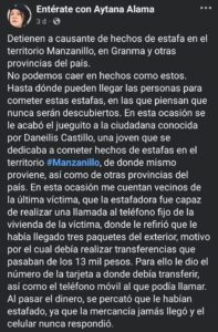 Una joven identificada como Daneilis Castillo fue detenida en la ciudad de Manzanillo, provincia de Granma, tras ser señalada como presunta autora de varios hechos de estafa cometidos en distintos territorios de Cuba. La noticia se dio a conocer a través del perfil oficialista Entérate con Aytana Alama, espacio que alertó sobre los métodos utilizados por la detenida y el impacto de este tipo de delitos en la población.