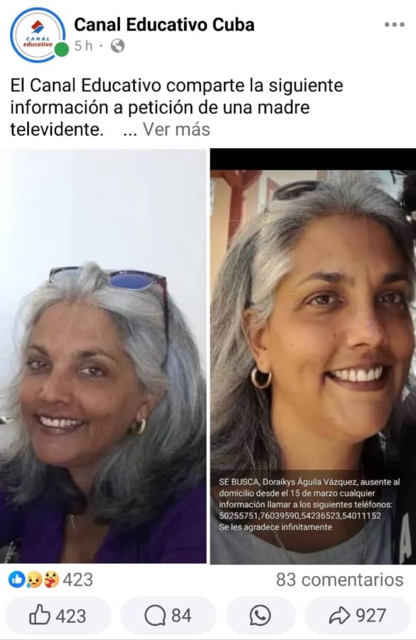 Varios organimos estatales se han hecho eco recientemente de la desesperación de una madre por lograr encontrar a su hija. Tal así como la Empresa de Transporte de La Habana y El Canal Educativo quienes han difundido en sus redes sociales un pedido de ayuda para localizar a una mujer que su familia nunca dejará de buscar hasta dar con su paradero.