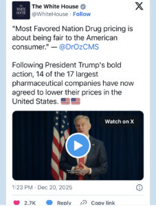 En el mensaje oficial, la Casa Blanca citó al director de los Centros de Servicios de Medicare y Medicaid (CMS), Mehmet Oz, quien aseguró que esta estrategia busca equilibrar el sistema y ofrecer precios más justos a los ciudadanos.