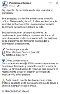 Ante la imposibilidad de acceder al fármaco necesario, los padres de Sheiran, encabezados por su madre Aime Martínez Cabrera, han iniciado una campaña de emergencia para localizar el medicamento, tanto dentro como fuera de Cuba. Han puesto a disposición el número de teléfono 56747077 para recibir información y coordinar cualquier ayuda posible. La familia cuenta con recursos para adquirir el medicamento en el extranjero, pero el tiempo es un factor crítico y cada minuto cuenta.