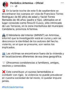 En la tarde-noche del 5 de septiembre, la provincia de Artemisa se conmocionó tras el hallazgo de los cuerpos sin vida de Francisco Torres Rodríguez, de 80 años, y su hijo Yaciel Torres Remedio, de 46. Las víctimas, quienes eran padre e hijo, fueron encontrados en la finca conocida como El Cusco, un área intrincada en Las Terrazas, municipio de Candelaria.
