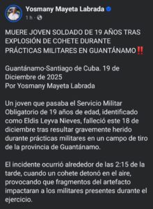 Un trágico accidente durante prácticas de tiro en Guantánamo cobró la vida del joven soldado Eldis Leyva Nieves, de solo 19 años, quien se encontraba cumpliendo el Servicio Militar Obligatorio. El suceso ocurrió en horas de la tarde del jueves 18 de diciembre, en un campo de entrenamiento perteneciente a la Unidad Militar 2431 de la Brigada de la Frontera.