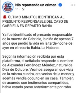Una profunda conmoción invade el Reparto Bahía en La Habana tras el trágico fallecimiento de Gabriela, una niña de apenas 7 años, en un caso que ha generado indignación generalizada. De acuerdo a lo revelado por la plataforma Nio Reportando Un Crimen, los hechos ocurrieron en la tarde-noche del sábado, cuando la menor salió a realizar un mandado en la misma cuadra donde residía y no regresó a su hogar. Su madre inició una búsqueda desesperada, sumándose rápidamente vecinos del lugar para localizarla.